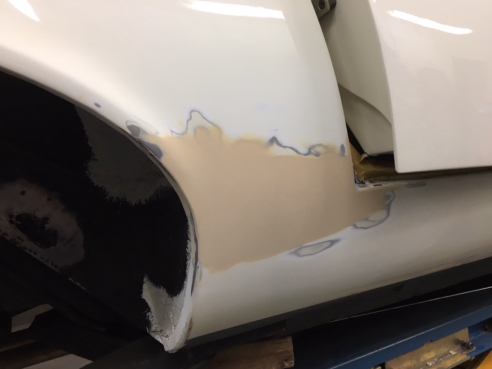 Our car, also a Series 3 E-Type, arrived in Estonia disassembled and soda-blasted, with the body mounted on wheels. Many of the body panels had already been replaced, and the metalwork had been finished with lead filler. Still, the car needed a skilled panel beater to refine the previous work and perfectly align the body panels. The last traces of rust were removed in Estonia, and even the hidden surfaces were thoroughly cleaned.